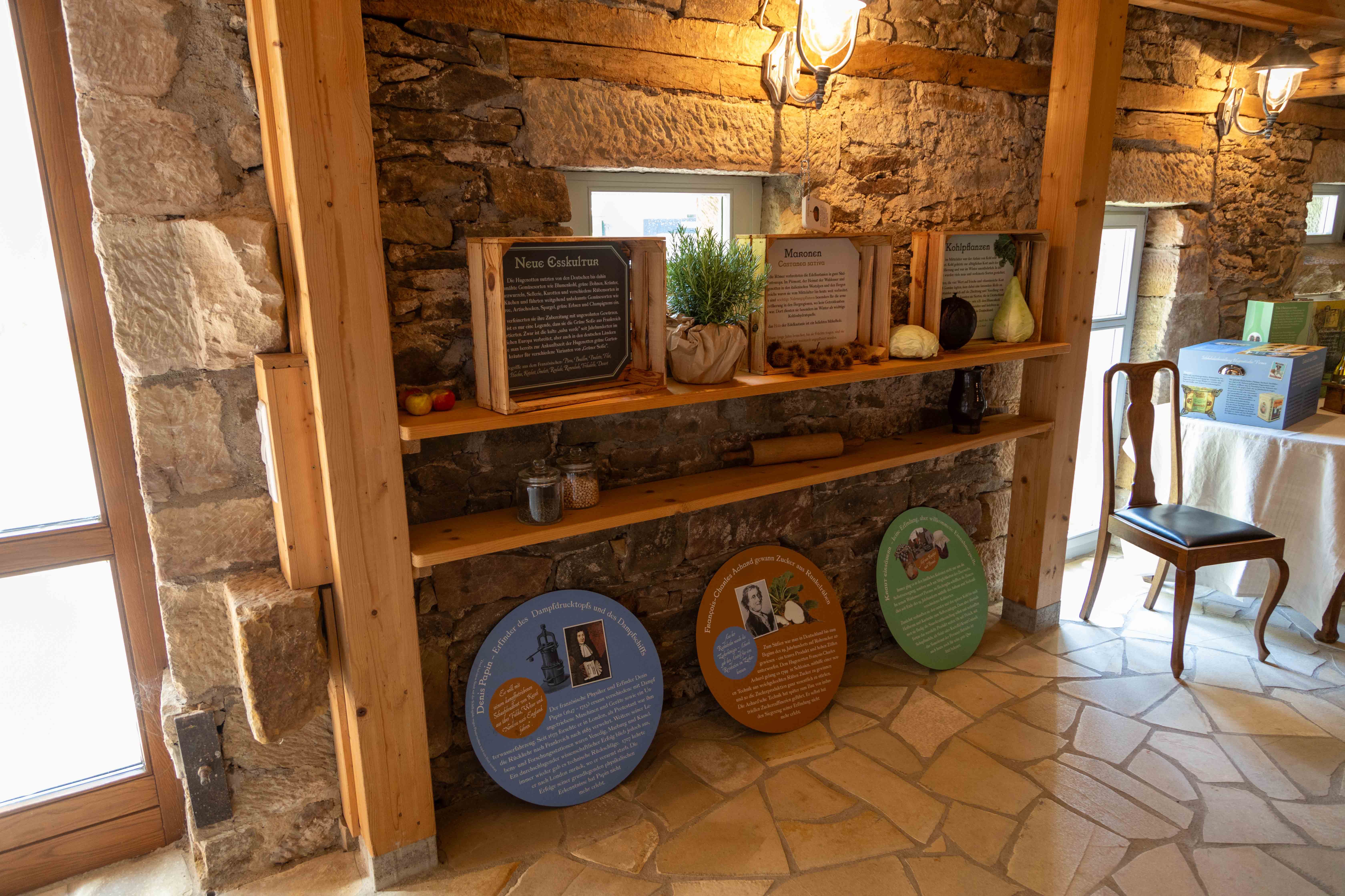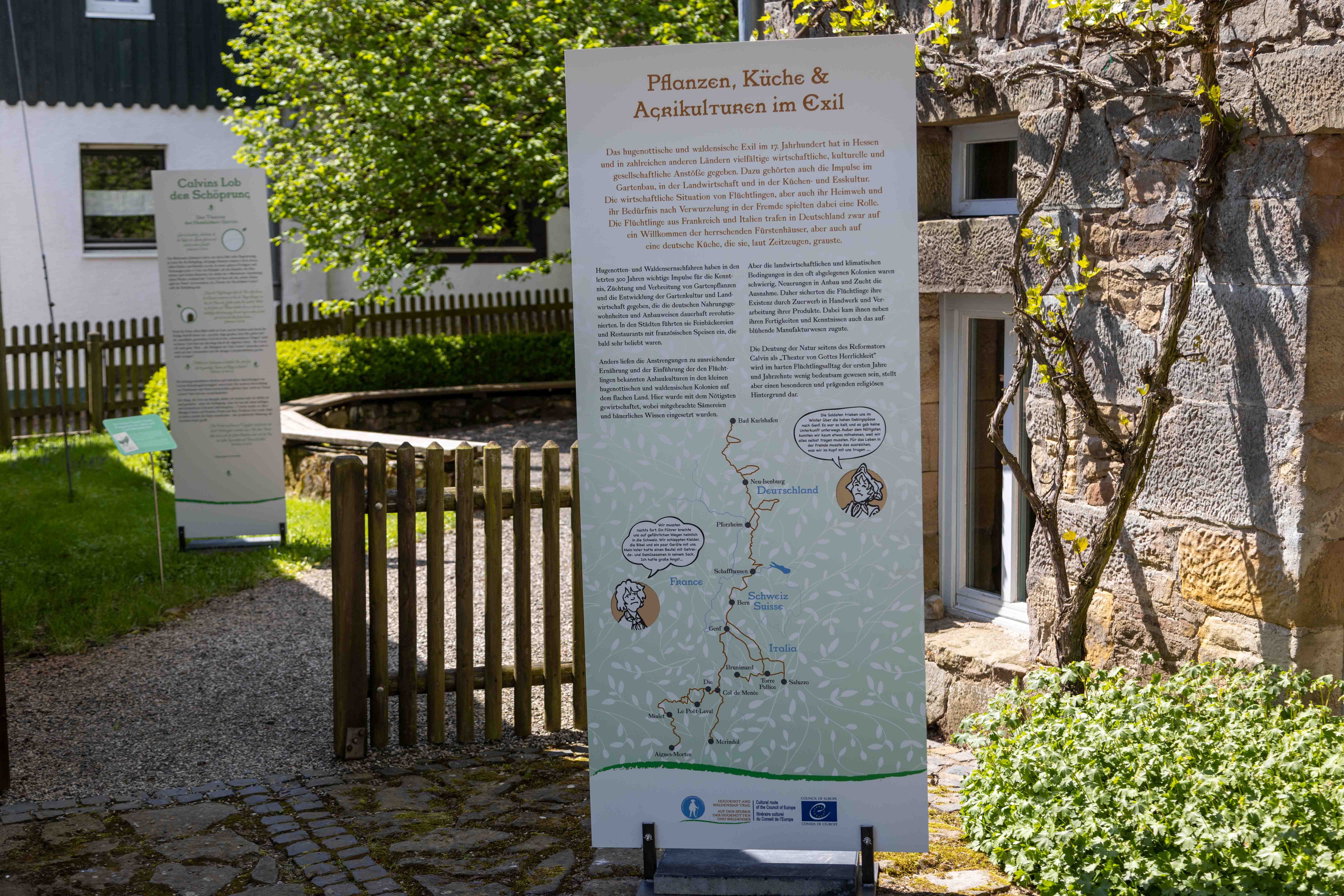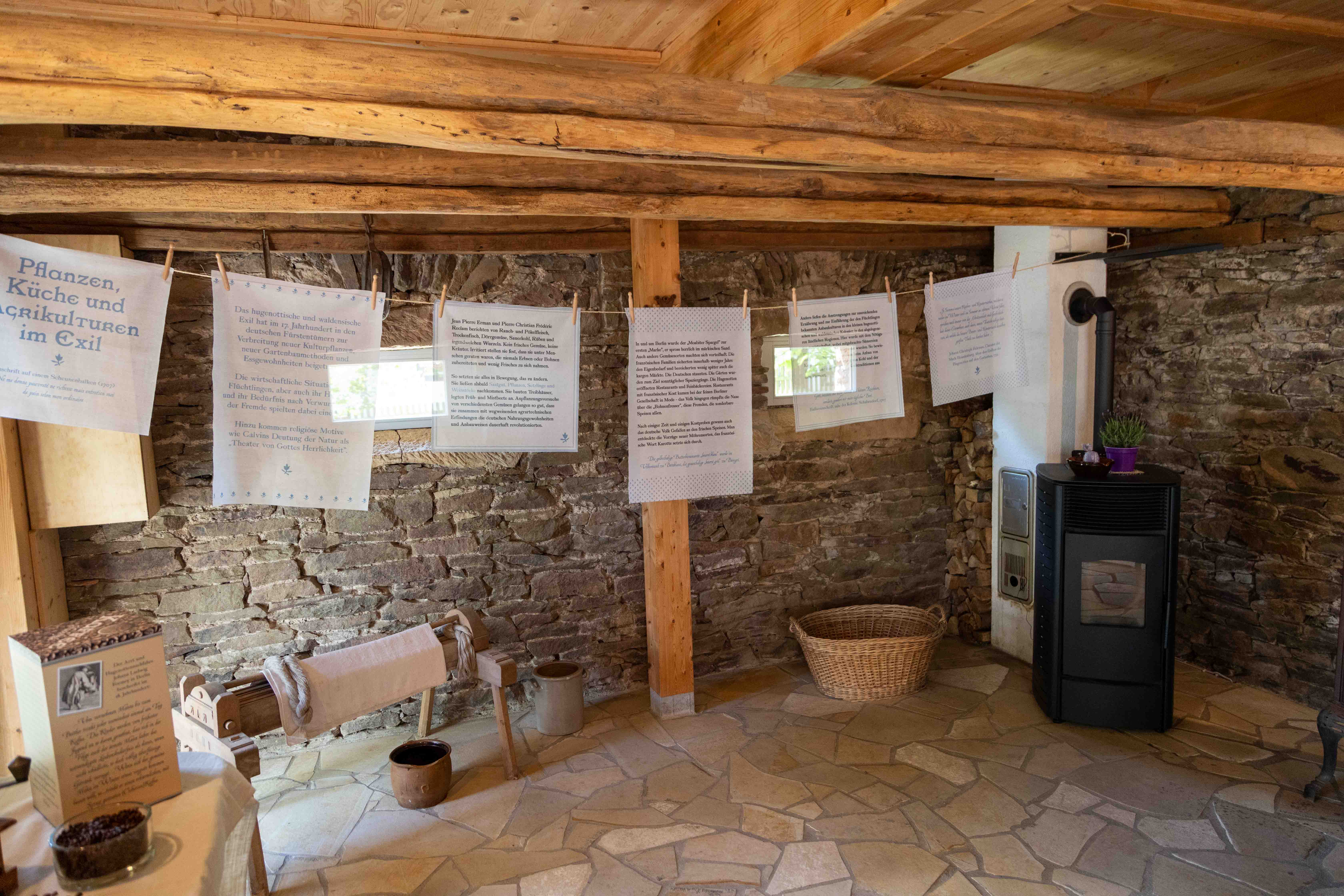 Unter dem Rahmenthema der Ausstellung „Exil, Integration und Verwurzelung“ werden die Beiträge der Hugenotten und Waldenser zur Kulturgeschichte von Acker- und Gartenbau, Ernährung und Kochkultur präsentiert. Die Ausstellung schlägt auch einen Bogen zu den Alltagskulturen der Migrantinnen und Migranten heute und den Aspekten der Integration über Küche und Essenskultur.